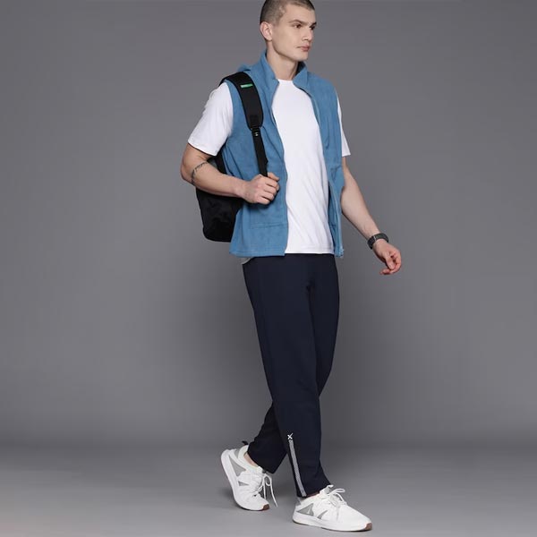 Bavy blue solid track pants, has an elasticated waistband with inner drawstring closure, 2 side pockets, regular length