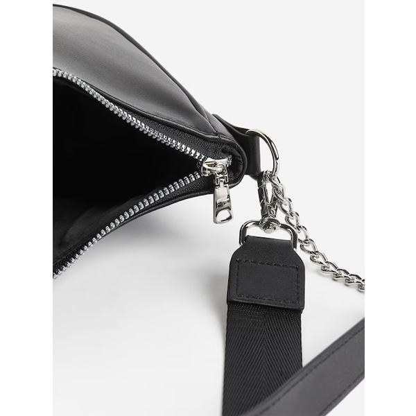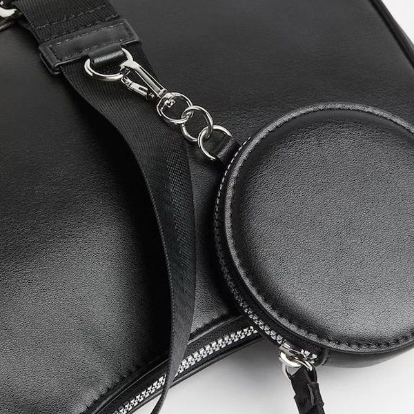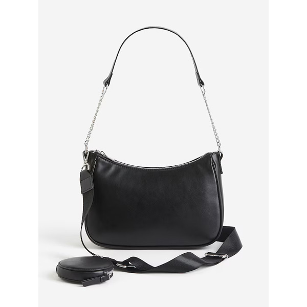 Small shoulder bag with a matching pouch. Bag with a zip at the top and a metal chain handle. Adjustable, detachable shoulder strap with a fastening for the pouch. Round pouch for storing earphones etc. Carabiner hook and zip at the top. The bag and pouch are lined in taffeta made from recycled polyester.