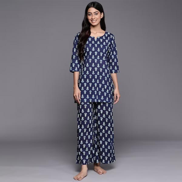 0 review(s) for "Women Navy Blue & White Printed Night suit"